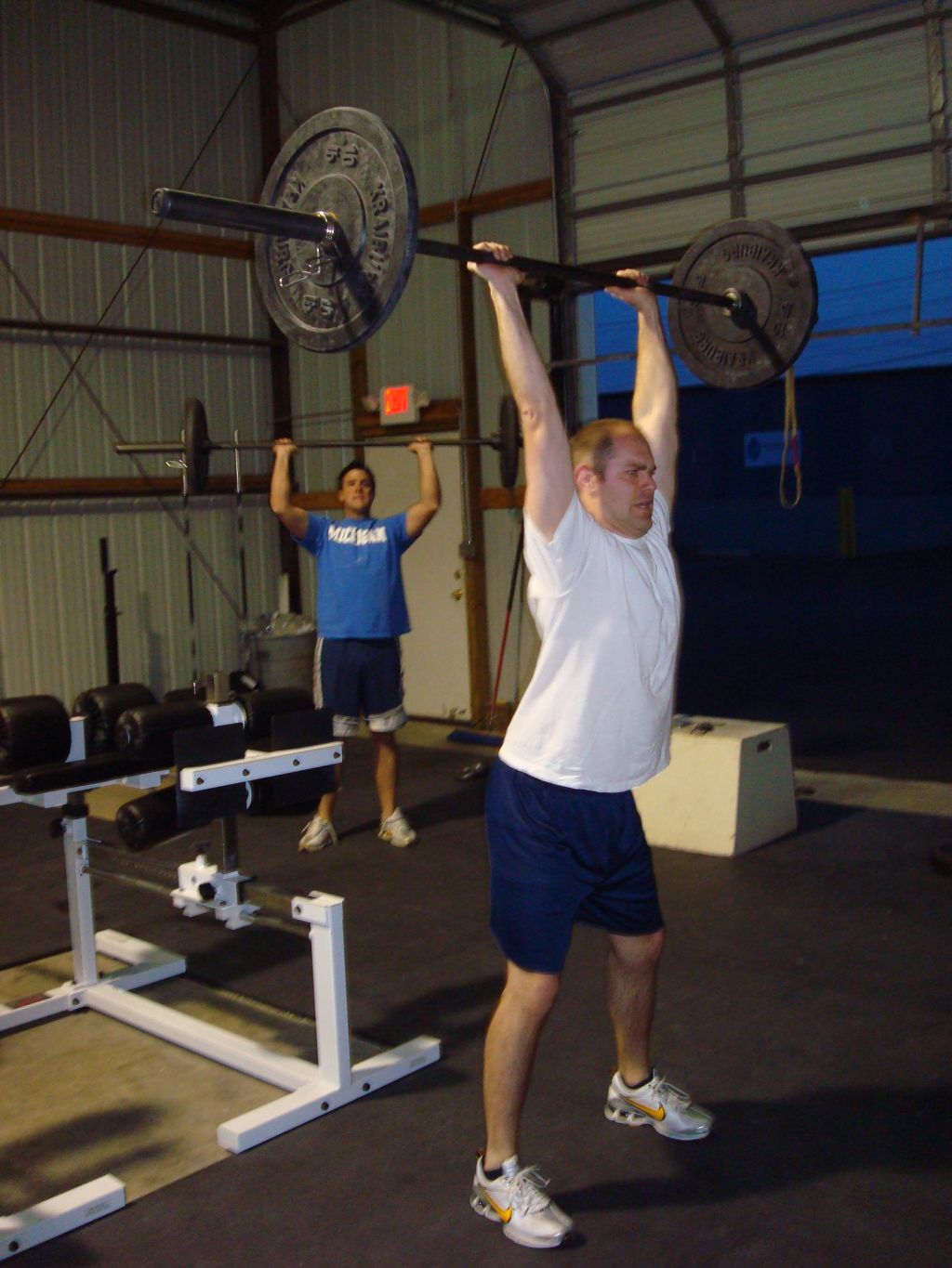WOD 3/17/08 Jake March 17, 2008WODs Today’s WOD: 5 Rounds: -100′ Overhead Walking Lunges with a 45# Bar -21 Burpees Never enough thrusters